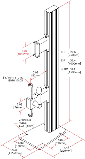 The MT150 Series features an innovative design that maximizes working space and simplifies operation and maintenance. The single column design with 150mm (6 in) throat is ideal for large specimens. The removable platen is designed to accommodate metric and imperial threaded fixtures. Special gauge adapter make gauge alignment automatic. Options include a digital travel indicator, capable of displaying travel up to 0.01mm (0.0005 inch) and column ruler which is graduated in millimeters and inches.
