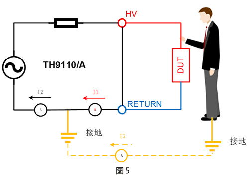 如图4,当人体不小心接触到测试高压端时,高压电路的低端(RETURN)并未接地,而是和地线隔离,相当于接入了一个高绝缘的电阻,因此通过人体的电流不会大于3.5mA,从而保证了测试人员的安全。本设计符合EN50191设备安全标准。
