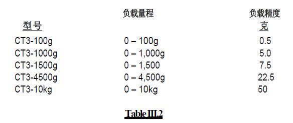 当连续添加砝码时,CT3将显示在相应仪器允许误差内的总重量,误差参阅Table III.2。CT3的精度通过负载量程的等级来定义,详情参阅Table III.2。如果CT3质构仪测得的数据超出允许范围,请联系Brookfield中国办事处以获得维修或校正服务。