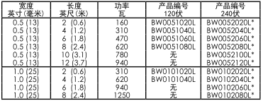 产品特色 极致柔韧 热响应迅速 经久耐用 适用于非导电材料表面(例如:玻璃) 可选择电源线在同一端或由两端分别引出 耐高温绑扎带易于安装 产品规格: 高达暴露温度: BWO系列:1400℉ (760℃) 结构: BWO系列:Samox 材料编织成型 功率密度: BWO系列:13.1瓦/平方英寸(0.020瓦/平方毫米) 120 或 240伏 订购信息: BWO系列:标准绝缘,耐高温 电源线在同一端 标注*号的型号不带插头。 电源线引出位置选项:如需电源线分别在加热带的两端引出,则在订购时去掉......