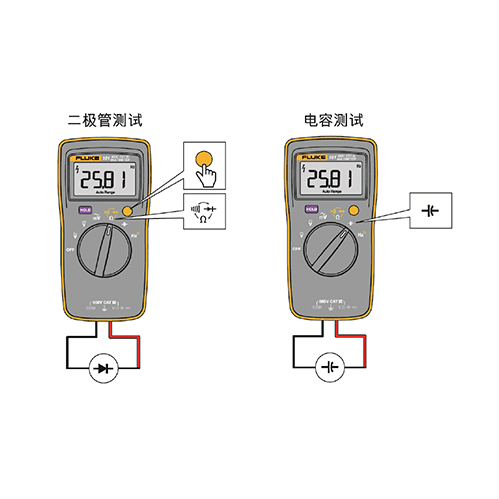 旋转开关调至电阻档位,按两次Shift键激活二极管测试模式,特尖表笔分别接触二极管引脚,红接阳极、黑接阴极,显示屏显示正向偏压值,数值异常或无显示则说明二极管损坏;反向接触显示“OL”,可快速区分正负极。