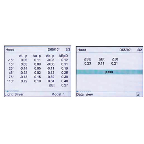 根据效果颜料的光学特性,闪烁感源于颜料颗粒对光线的定向反射强度差异,而颗粒感则与颜料颗粒的大小、分布密度直接相关。BYK-mac i7031多角效果测色仪的内置图像分析算法,能够对CCD相机捕捉的图像进行灰度值分析、颗粒轮廓识别与光强度分布计算,最终输出闪烁强度(S_i)、闪烁面积(S_a)及颗粒感参数(G)等量化指标。同时,仪器可通过对比样品与标准样品的效果参数差值(如ΔS、ΔG),直观反映两者的外观效果差异。这一原理设计实现了效果涂层外观特性从定性描述到定量分析的突破,为效果涂层的配方优化与生产质量管控提供了客观依据,也是BYK-mac i7031多角效果测色仪区别于传统单一颜色检测设备的核心优势之一。