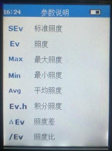 实时照度(Lux),积分照度(Ev.h & Ev.m单位可切换),平均照度(Lux),很大照度(Lux),很小照度(Lux),光通量(Lm),照度比(%),照度差(△Lux),积分时间(h & m可切换)