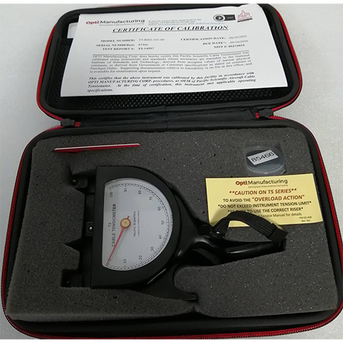 航空机载控制电缆的张力精度直接决定飞行操控安全性,从起飞阶段的襟翼调节到巡航中的舵面控制,电缆张力偏差可能引发致命故障。传统张力测试设备普遍存在适配性差、读数误差大、环境耐受弱等问题,难以满足民航维修对精准度与可靠性的双重要求。OPTIMANUFACTURING作为AS9100与ISO9001双认证企业,其T5-8002-105-00张力计依托T5-8000系列成熟技术平台,以机械精密传导为核心,融合严苛的材料选型与校准标准,成为航空电缆张力测试的标杆设备。这款仪器不仅解决了狭小机舱操作、极端环境适配等场景痛点,更以±2读数点的精度控制,为全球航司提供符合MIL-T-38760标准的测试解决方案,筑牢飞行安全的第一道防线。