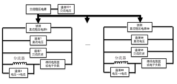 每台直流稳压电源直流电压输出需要配置一个通道进行监测(通道1),直流电压输出的交流纹波需要配置另外一个通道进行监测(通道2)、 直流电压输出接负载后的输出电流(通道3)一般比较大,可以考虑用外部分流器并用数采的一个电压通道进行监测,这样一台稳压电源输出部分至少需要三个监测通道,第二台电源再顺序连接接下来的3个通道,那么单台2638A 60个通用测试通道可同时进行20台电源的校准工作,2638A的前面板测试通道(001)可以监测可调交流稳压电源电压输出,确保交流供电在额定电压和可调范围上下限变化,并配合验证各台直流稳压电源的源电压调整率等校准参数的准确性。