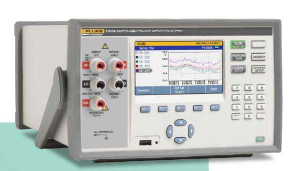 在通道配置方面,仪器支持最多40个通用输入通道,通过内置与外置两种接线模块的灵活组合,可适配不同场景的测量需求。内置的1586-2586接线模块每个提供20个通道,适用于工业现场环境下的温度测量及通用数据采集,支持2线、3线或4线连接方式;外置的1586-2588接线模块则专为高准确度温度测量设计,配备20路微型热电偶输入插口和10个4线镀金微型按压插座,无需工具即可快速完成传感器的安装与拆卸,特别适合实验室校准场景。 仪器的扫描速度可根据需求灵活调整,最快可达10通道/秒,能够快速捕捉动态测量数据;同时支持扫描、监测、测量、数字表(DMM)四种功能模式,满足从连续监测到单点测量的多样化需求。实时彩色曲线图形功能可同时显示最多4个通道的测量趋势,帮助用户直观掌握参数变化规律;而传感器自动校准功能则可通过RS-232接口控制福禄克热源(如计量炉、恒温槽),自动完成传感器校准流程,大幅提升工作效率。